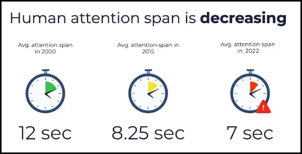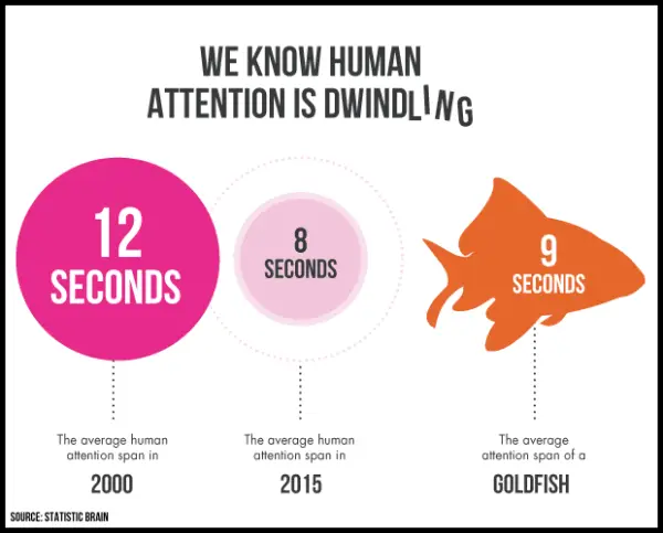 A Microsoft study found that people’s attention spans dropped from 12 seconds in 2000 to 8.25 seconds in 2015. This was a milestone because goldfish have an attention span of 9 seconds.